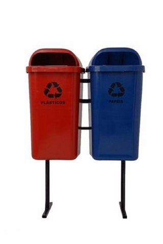 COLETOR - CESTO - LIXEIRA - CONJUNTO - KIT - para coleta seletiva com suporte para 02 papeleiras de 50 litros cada. Fabricada em polietileno de alta densidade (injetada), com corpo e tampa aditivado contra raios ultravioletas. Possui fechadura metálica com chave em alumínio e apagador de cigarros em aço inox. Suporte para fixação das lixeiras em aço carbono galvanizado com proteção contra corrosão.