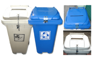 CONTAINER - CONTENTOR - LIXEIRA - CARRO COLETOR fabricado em polietileno de alta densidade, com 02 rodízios e capacidade de 120 litros. Possui fenda e lacre para documento confidenciais ou material infectante.Possui proteção UV 08.